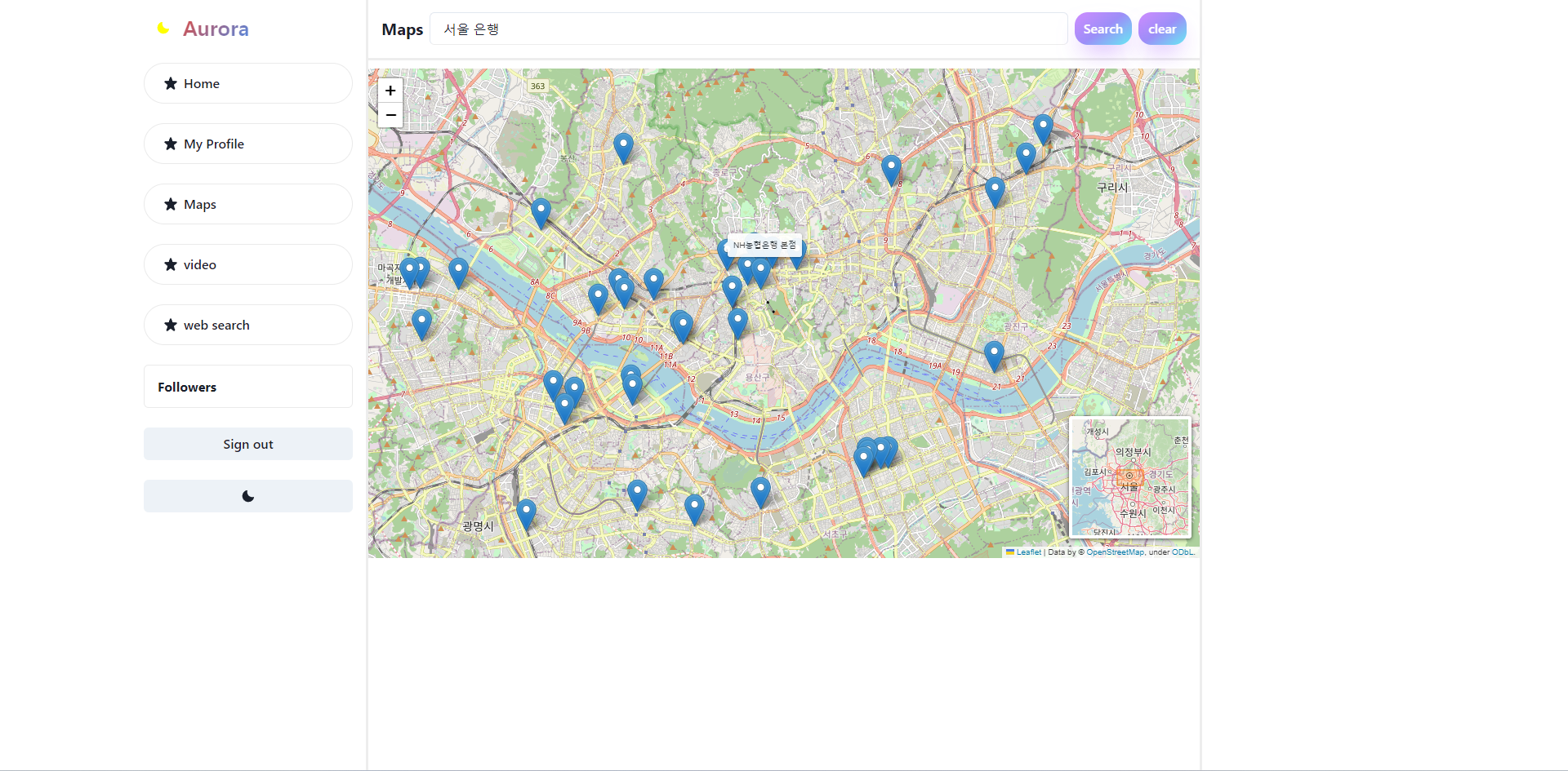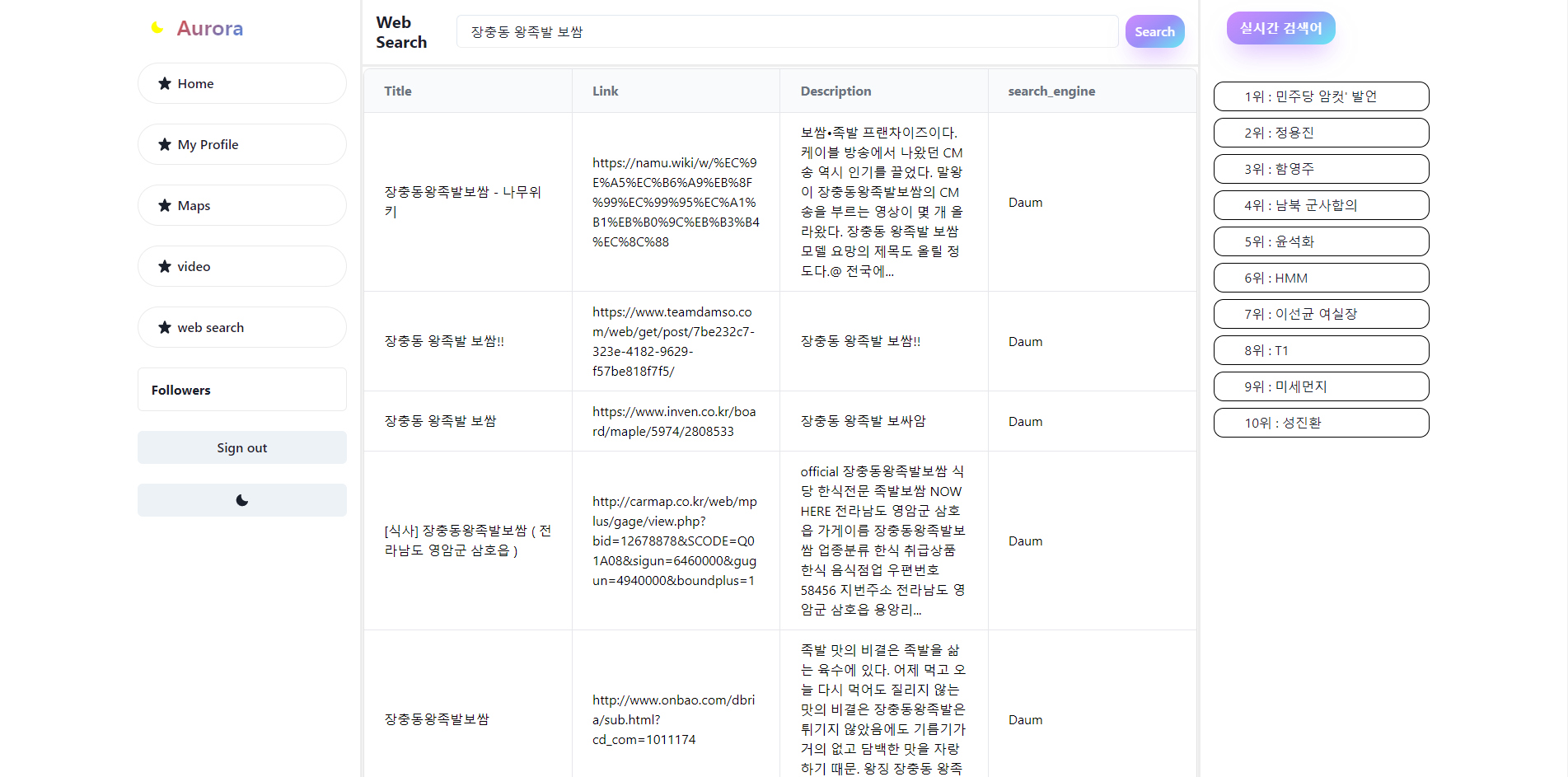Aurora-(9)지도기능, video 기능, api를 활용한 웹 크롤링 기능, 실시간 검색어 순위 제공