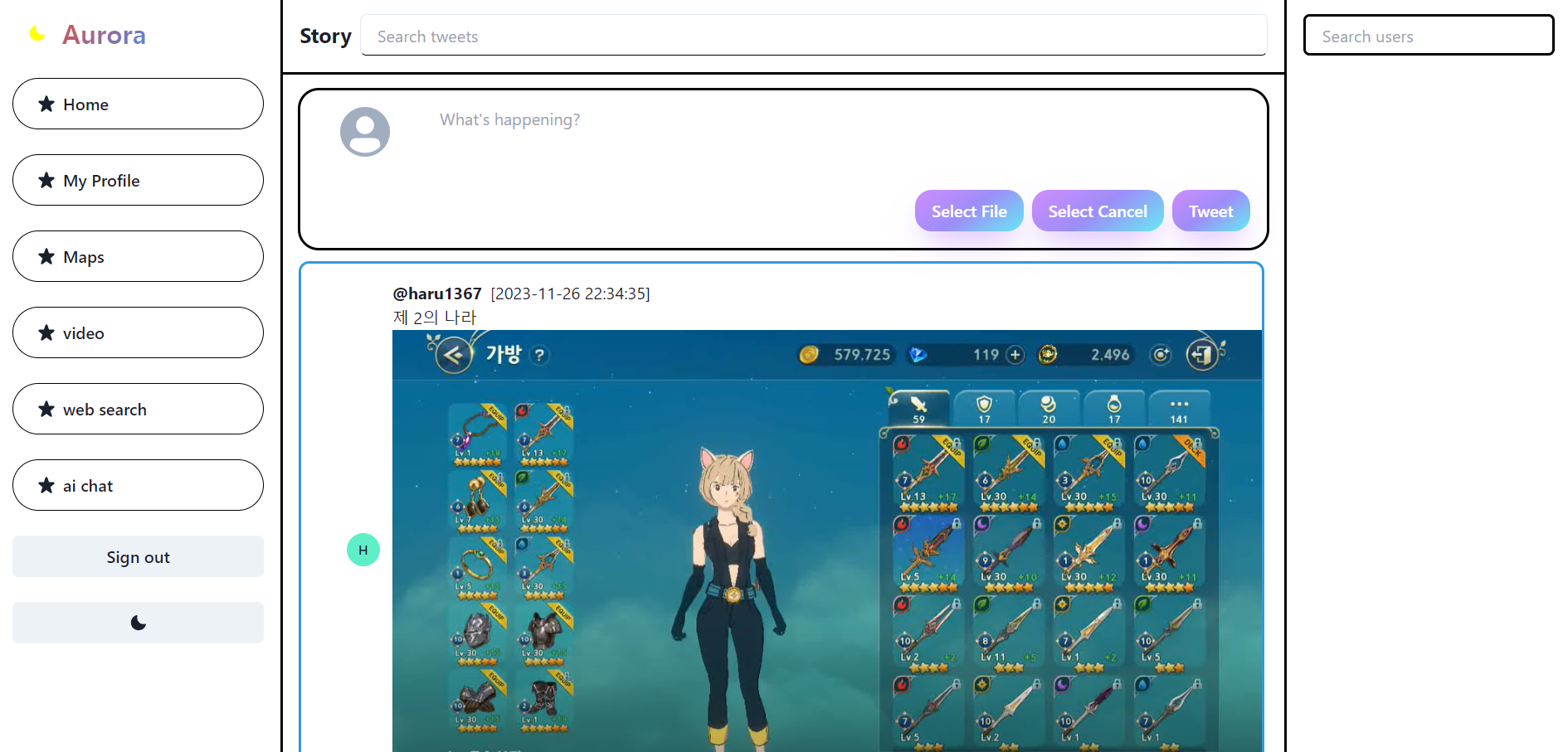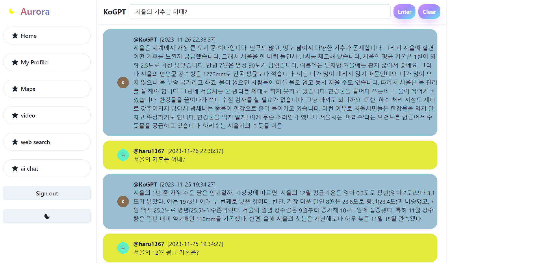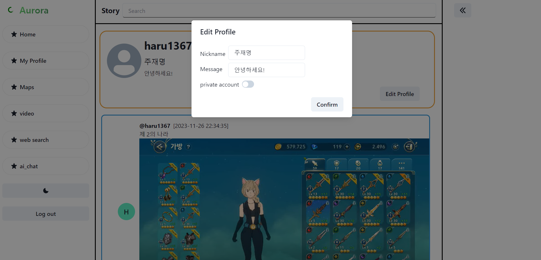 Aurora-(10) 각종 UI 수정, 개인 프로필 화면 추가, AI Chat 모드 추가
