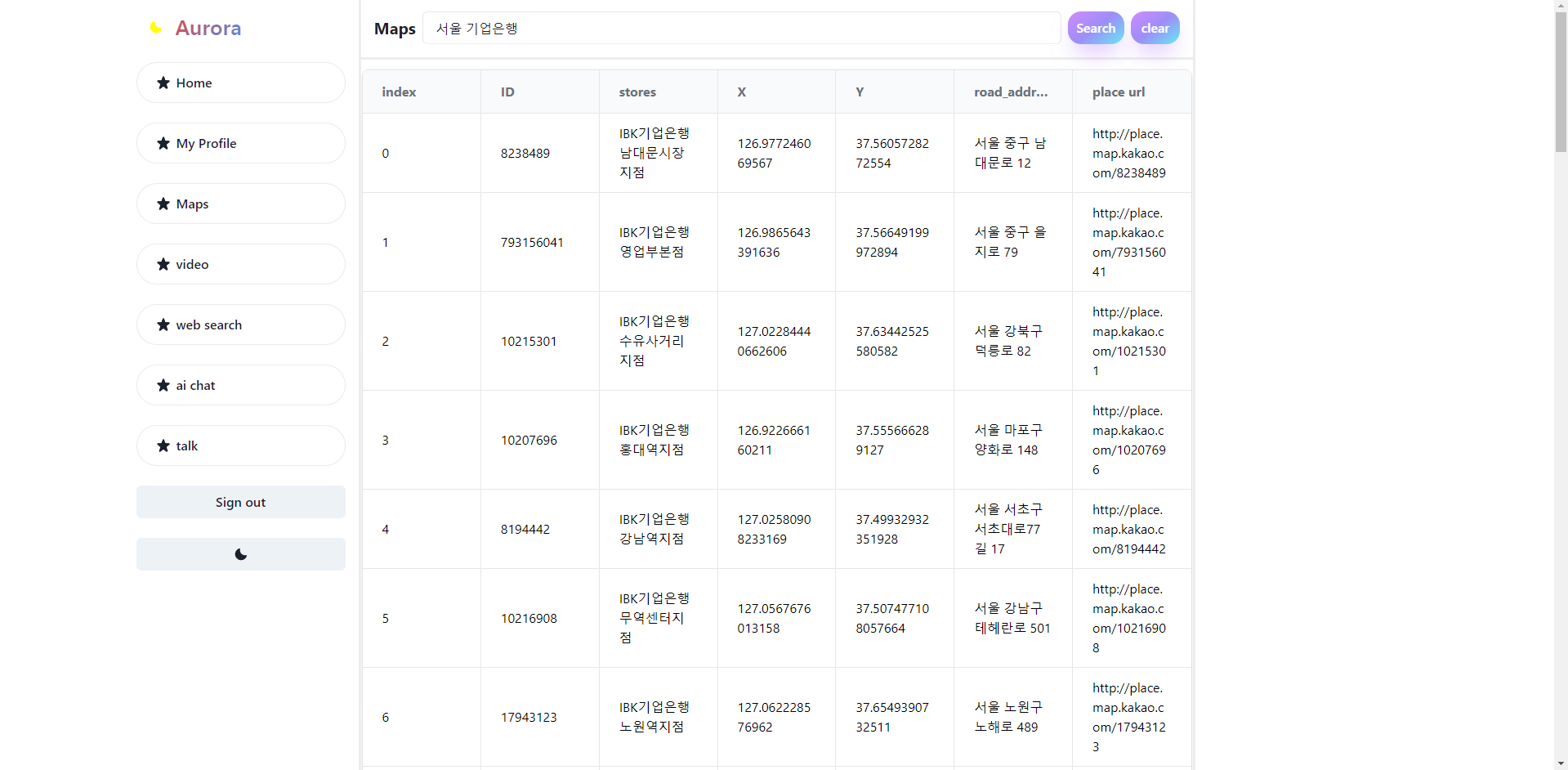 --> 맨 위 입력칸에 키워드 입력시 kakao api를 활용해 키워드와 관련있는 장소를 검색하고 결과를 데이터프레임으로 제공하는 기능