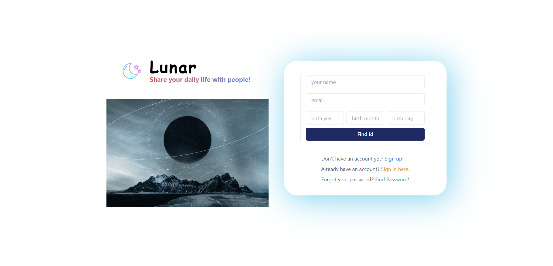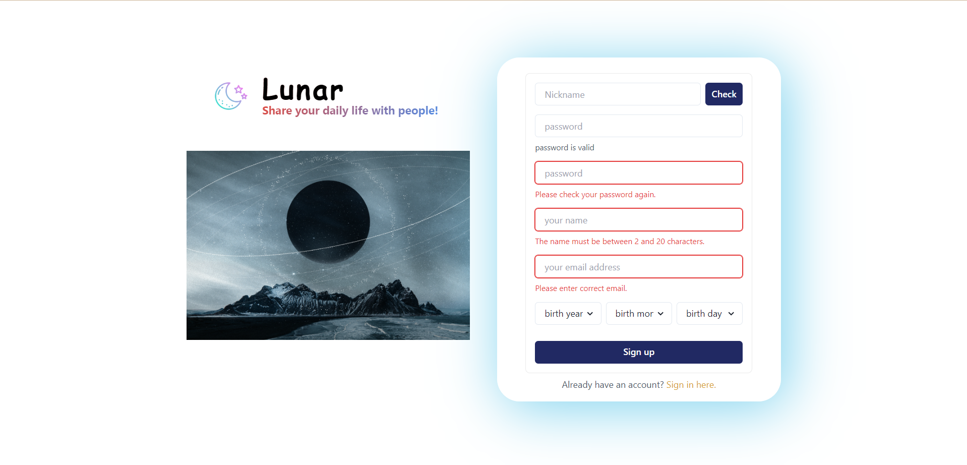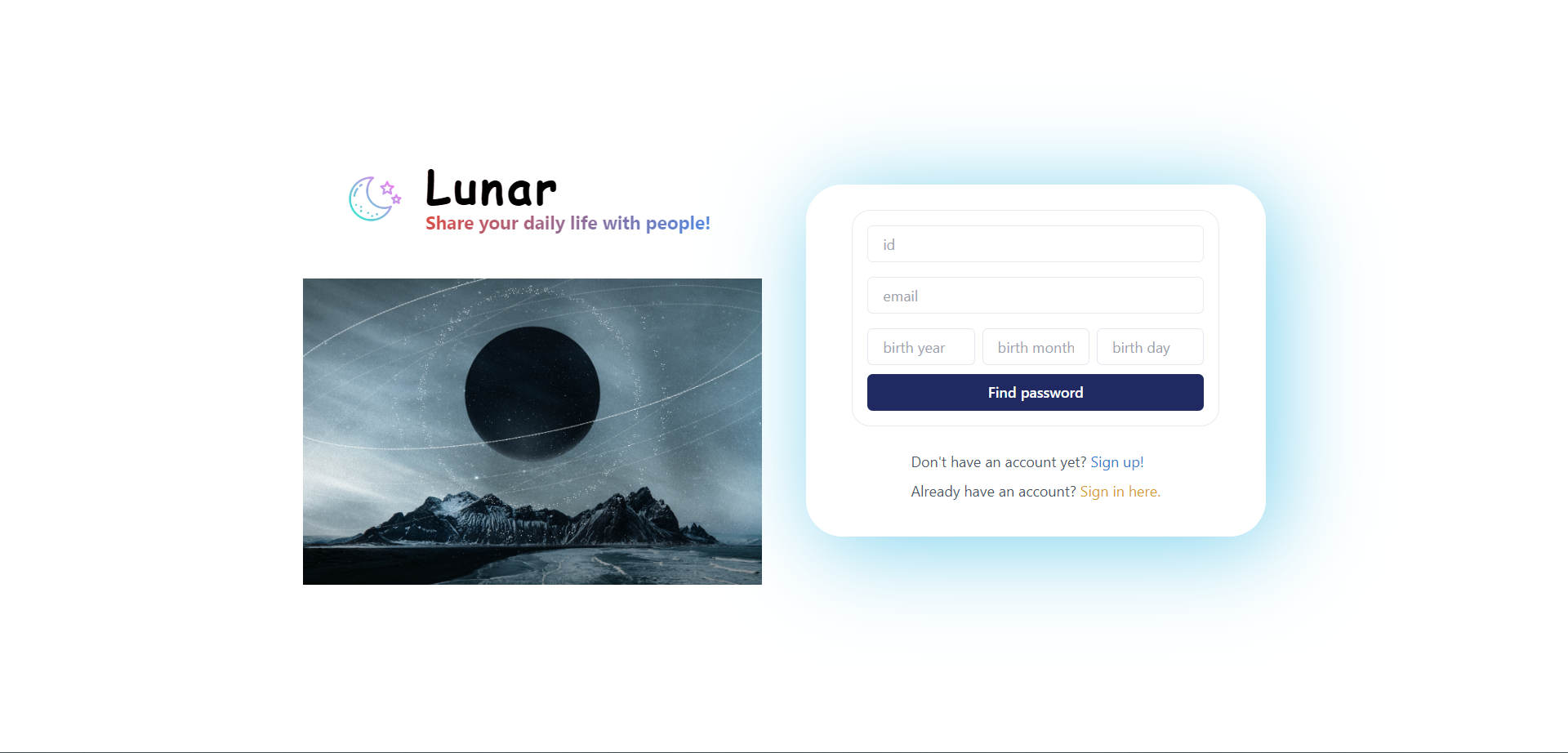 | Lunar-(2)로그인화면 UI개선, 회원가입화면 생일설정, 이름, 이메일 정보 추가 (1) | 2023.12.04 |